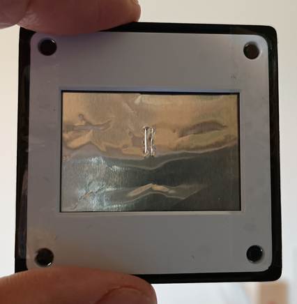 1.- Una primera opció per a aconseguir una doble escletxa és fer-la en un quadradet de paper d’alumini amb un cúter. És fàcil, encara que s’ha de fer amb delicadesa. Es poden aconseguir dobles escletxes amb diferents distàncies entre elles però no molt juntes ja que es trenca la làmina entre les escletxes. En tot cas la distància entre les escletxes ha de ser prou petita per a que el feix de la llum del làser passi per totes dues alhora.