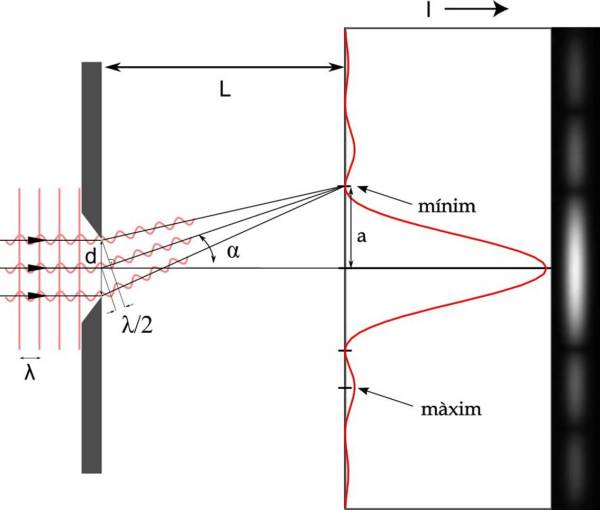 Ja hem vist que en el cas d’una ranura simple el sinus de l’angle α del primer mínim de difracció per a angles prou petits és,