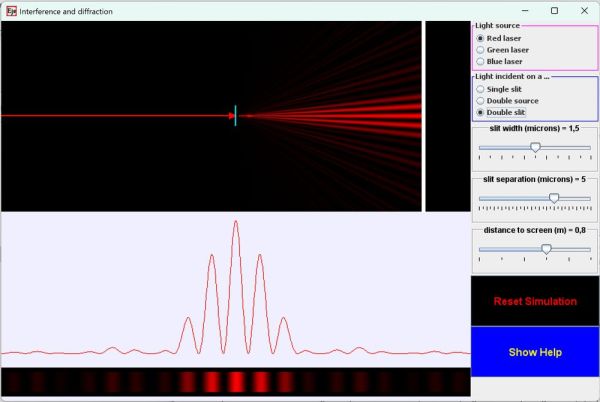 Alternativament a l’experimentació real teniu un parell de simulacions (entre altres que podeu trobar a internet) que m’agraden molt per estudiar quantitativament la difracció de la llum d’un làser a través de dues escletxes (i també d’una i de varies) a la web Compadre de l’Asociació americana de professors de física. Una és Diffraction and Interference Model: Single and Double Slits escrita per Andrew Duffy i l’altra Multiple Slit Diffraction Model, escrita per Fu-Kwun Hwang.
