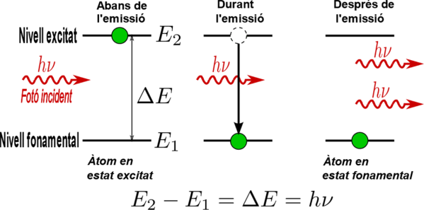 Un electró en un nivell d’energia excitat tendeix a tornar al seu estat fonamental (emissió espontània) i, en fer-ho, allibera l’energia extra en forma d’un fotó. Aquesta emissió passa de forma aleatòria, en qualsevol direcció i amb qualsevol fase. És així com funciona l’emissió de llum en una bombeta convencional.
