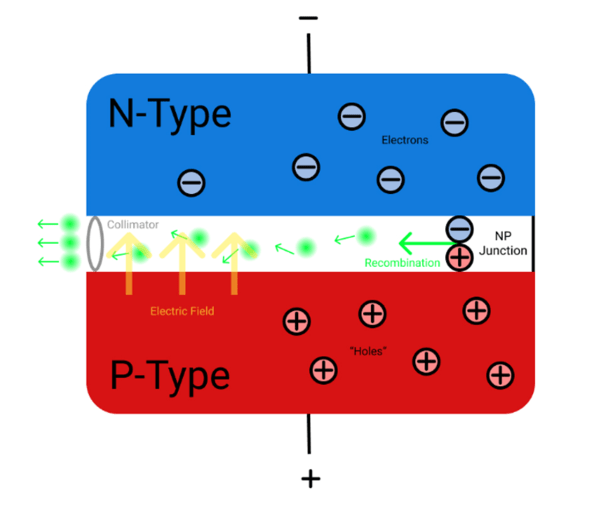 Quan s’aplica un voltatge adequat a aquesta unió P-N, els electrons del material N i els buits del material P són injectats cap a la regió de la unió on els electrons poden recombinar-se amb els buits. Quan un electró es recombina amb un forat cau a un nivell d’energia inferior i l’energia sobrant s’emet en forma de fotó.