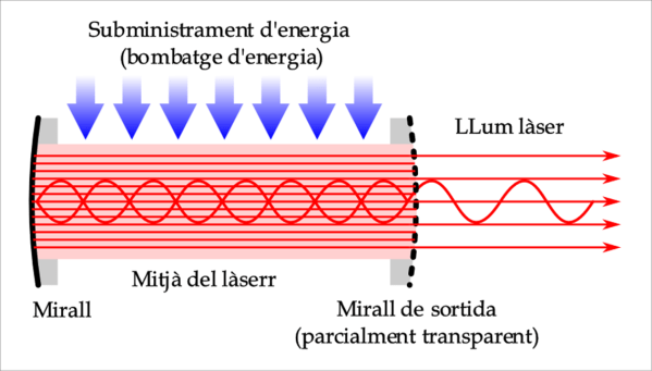 Els fotons emesos per emissió estimulada van de banda a banda entre els miralls estimulant l’emissió de més i més fotons idèntics i el mirall parcialment reflectant permet que una part d’aquesta llum amplificada escapi, formant el feix làser.