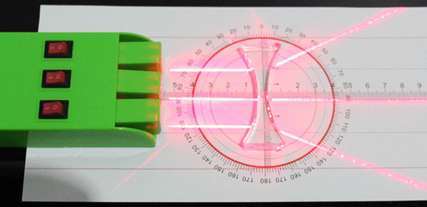 Una altra possibilitat per veure en medis transparents el raig del làser és col·locar davant on surt el feix de llum un bocinet de vareta de vidre de les que usem al laboratori per remenar els líquids de manera que actua com una lent, fen divergir el feix de llum i escampant-lo. Però en lloc de fer-lo tu mateix una altra possibilitat és comprar una de les caixes amb tres llums làser que venen per a fer experiments d’òptica geomètrica en les que els feixos de llum dels làsers ja surten escampats.