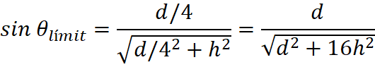 En el cas que ens ocupa, per a calcular el valor de d (diàmetre del cercle fosc) hem de considerar que θ1 correspon a l’angle límit en passar la llum de l’aigua a l’aire i θ2 és igual a 90º (sin90º = 1), sent l’índex de refracció de l’aire n2 = 1. Per tant,
