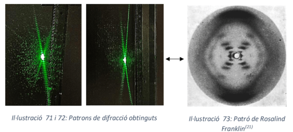 Allí està explicat de forma breu, però afortunadament Ivet Güell, sota la direcció d’Anicet Cosialls va fer al 2023 el seu treball de recerca del Batxillerat sobre el descobriment de l’estructura de l’ADN i els treballs de Rosalin Franklin amb el títol La Física de la Vida. Determinació experimental de l’estructura de l’ADN. A partir de la pàgina 40 del treball explica detalladament el disseny experimental de la simulació i els resultats que obté, fent un anàlisi quantitatiu molt interessant.