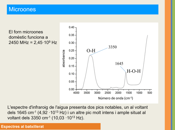 Preparant una xerrada sobre espectroscòpia al batxillerat que vaig fer recentment al curs Reptes actuals de les Ciències del departament d’Educació pensava en introduir en el discurs alguna anècdota per trencar-lo i revifar l’atenció ja que havia de ser una hora seguida de rotllo. Vaig pensar en l’escalfament al microones dels aliments que contenen aigua i com moltes vegades es diu que s’escalfen en absorbir l’energia de les microones “fent vibrar ” les seves molècules, el que hauria de ser al infraroig. Per exemple aquí.