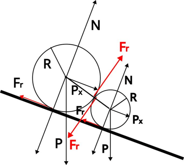 La clau està en que ara la força que exerceix la bola gran sobre la petita és prou gran per aconseguir una força de fregament màxima entre les boles més gran que la força de fregament de cada esfera amb el pla inclinat, de manera que el moment total de les forces sobre cada bola és zero.