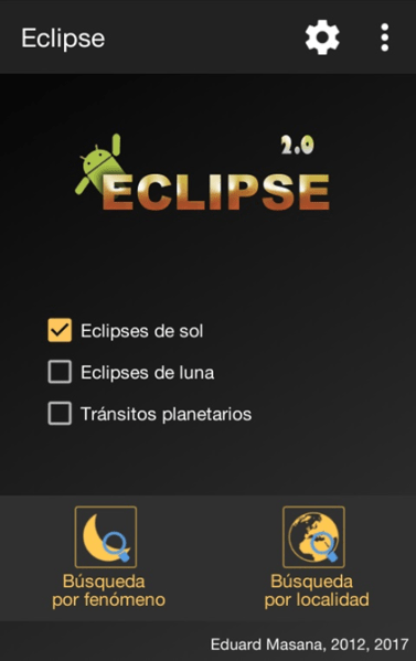Per últim, us recomano l’aplicació per Android Eclipsi 2.0 que ha dissenyat i elaborat el professor Eduard Masana, investigador de l’Institut de Ciències del Cosmos, ICCUB (IEEC-UB) i membre del Departament de Física Quàntica i Astrofísica de la Universitat de Barcelona. És molt complerta: preveu i simula eclipsis de Sol i de Lluna i transits planetaris, i aporta un munt d’informació al respecte. En el web Serviastro, hi ha penjat un petit manual de l’app.