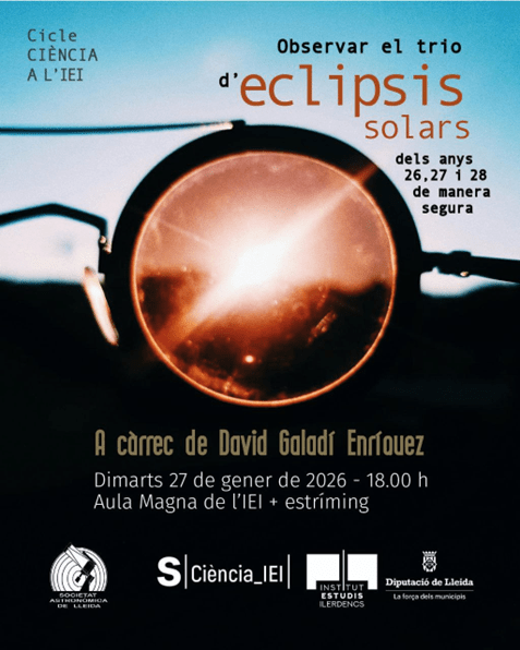 Com ja sabeu tots, aquest any i els propers 2027 i 28 tindrem l’oportunitat a casa nostra de veure tres eclipsis solars. Per anar escalfant motors, des de la Secció de Ciències de l’IEI (Institut d’Estudis Ilerdencs) i la Societat Astronòmica de Lleida han preparat un cicle de quatre conferències i un taller que es realitzaran durant els mesos de gener i març a l’antic Hospital de Santa María. Les dates i els conferenciants son: