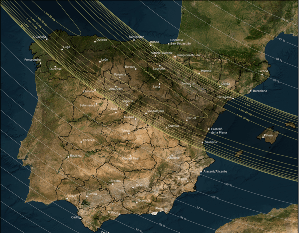 Aquest primer eclipsi d’aquest any serà el 12 d’agost sobre les 8,30 hores de la tarda i es podrà veure total en la franja dibuixada de la imatge de sota, és a dir, des de la mateixa Lleida. Els altres eclipsis seran el 2 d’agost de 2027 i el 26 de gener de 2028.