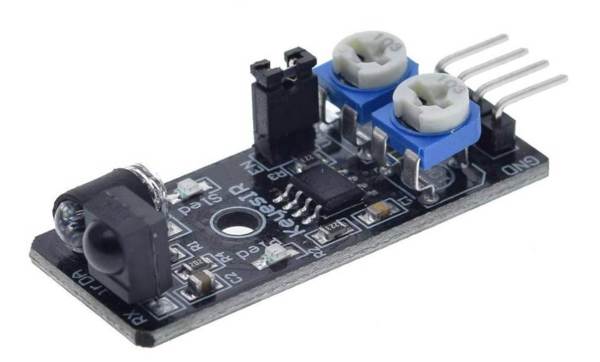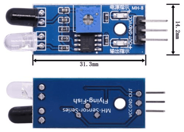 És un sensor d’obstacles per infrarojos clàssic (molt usat amb Arduino i de la sèrie Fling-Fish MH-Sensor). Si falla al funcionar es pot ajustar la distància de detecció (sensibilitat) amb el potenciòmetre blau que es veu al centre del dispositiu.