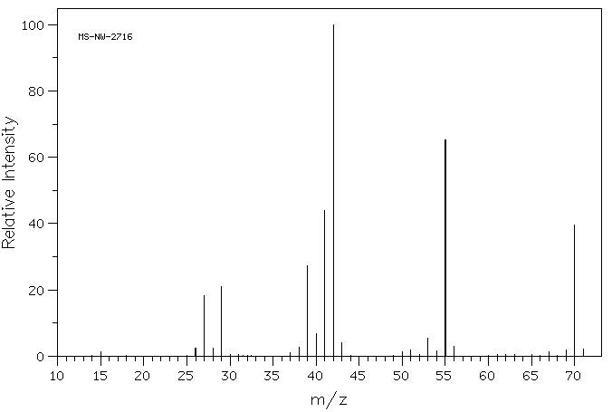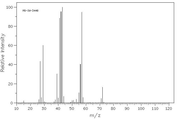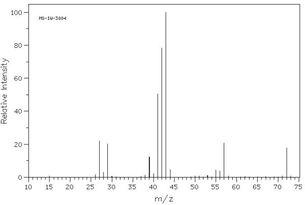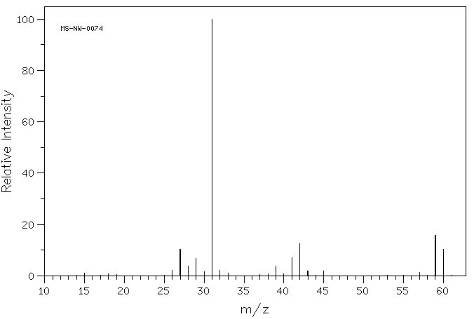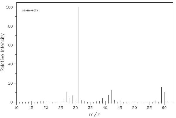 Aquest és l’espectre de masses del 1-propanol. El ió molecular (CH3-CH2-CH2OH+) apareix com el pic amb un valor de massa més gran (60), que correspon a la massa de la molècula del compost. No és el pic més alt ja que no és el fragment més estable.