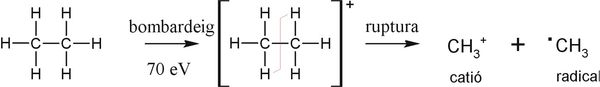 La ionització d’una molècula orgànica normalment requereix d’aproximadament de 10-15 eV, amb la qual cosa és factible obtenir el ió molecular. No obstant, en l’espectrometria de masses, les molècules se sotmeten a un bombardeig electrònic de 70 eV. D’aquesta manera un electró és remogut de la molècula formant un catió d’alta energia i a continuació eventualment el catió es fragmenta per a dissipar el seu excés d’energia.