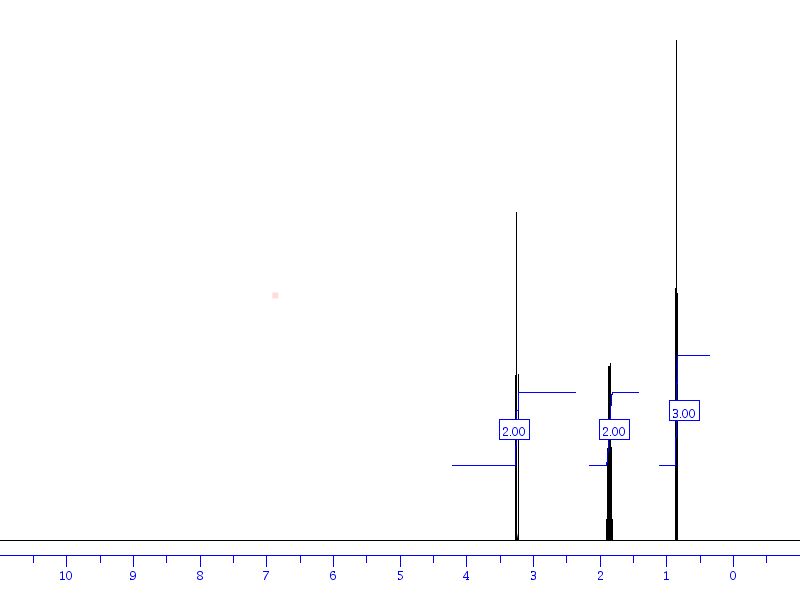 Si el compost fora l’1-bromopropà (CH3-CH2-CH2Br) ens trobaríem tres grups d’hidrògens amb diferent apantallament, el que donaria un espectre amb tres pics en la proporció 3:2:2, com es veu en l’espectre RMN de sota: