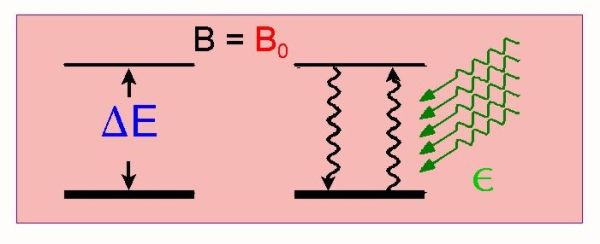 Per altra banda, el canvi d’orientació dels nuclis d’hidrogen en el si del camp magnètic pot fer-se mitjançant l’absorció d’un quant de la radiació electromagnètica adequada: ΔE = h·ν