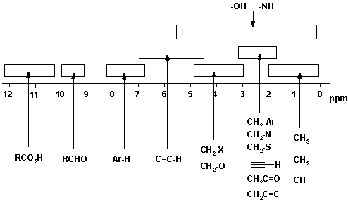 A la taula anterior es presenten alguns marges aproximats de desplaçaments químics de protons situats en distints ambients químics.