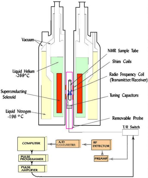 Per tal d’aconseguir que el material superconductor funcioni com a tal ha de trobar-se a temperatures suficientment baixes, el que s’aconsegueix introduint-lo en un bany de heli líquid, envoltat a la seva vegada en nitrogen líquid, com s’indica en el dibuix de sota, de manera que els espectròmetres de RMN actuals tenen la pinta del de la fotografia.