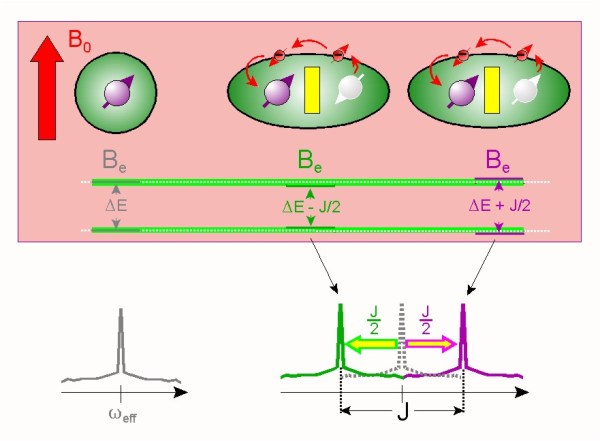 Si el nucli d’hidrogen, Ha, té un altre hidrogen veí, Hb, a 3 enllaços de distància, patirà el camp extern aplicat B0 i el produït per l’electró de l’altre hidrogen. L’altre protó Hb pot tenir dues orientacions respecte al camp aplicat: paral·lela i antiparal·lela. En la meitat de les molècules el camp creat per Hb s’addicionarà a B0 i en l’altra meitat de les molècules s’oposarà. D’aquesta manera, el protó Ha patirà un camp net diferent en cada meitat de les molècules i apareixeran, per tant, dos pics en l’espectre. Les intensitats relatives dels dos pics són idèntiques i el senyal s’anomena doblet. La separació entre els pics desdoblats es denomina constant d’acoblament, J (en Hz) i el fenomen s’anomena acoblament espín-espín.
