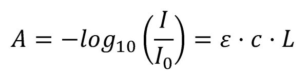 on A és l’absorbància, I0 és la intensitat de la llum incident en la mostra amb una determinada longitud d’ona, I és la intensitat de transmissió, L la longitud de ruta a través de la mostra, c la concentració de les espècies absorbents i ε el coeficient d’absorció. De vegades l’absorbància es defineix en termes de logaritme neperià en lloc de logaritme de base 10.