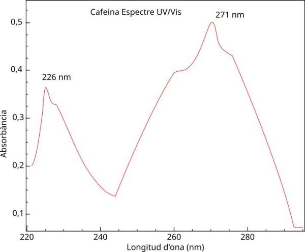 A partir de la cafeïna purificada se prepara una dissolució de cafeïna en diclorometà de concentració 40 mg/L, i partir d’aquesta dissolució s’obtenen les solucions estàndard de concentracions donades més petites. Amb una d’aquestes dissolucions, de 18,0 mg/L, es realitza l’espectre d’absorció de la cafeïna entre els 220 i els 300 nm i dona com a resultat el gràfic de la figura 1.
