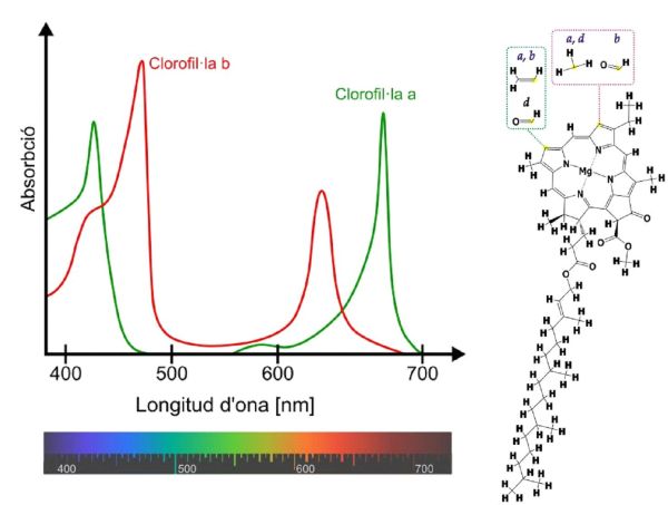 Com exemple d’una molècula orgànica amb gran quantitat de dobles enllaços conjugats tenim la clorofil·la (mireu la fórmula) que és una substancia present als vegetals, fonamental pera que puguin realitzar la fotosíntesi. A la gràfica de sota hi és l’espectre UV-Vis de les dues formes a i b de la clorofil·la. Com s’aprecia la clorofil·la absorbeix la radiació de la zona blava i vermella del espectre visible de la llum, per la qual cosa la veiem de color verd.
