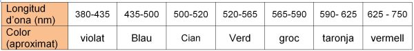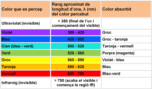 Aquesta és una taula guia que indica aproximadament de quin color es veu una substància o solució si s’absorbeix el color especificat (Si es veu el color de la primera columna és que s’absorbeix el de la tercera, són aproximadament els colors complementaris de la llum).