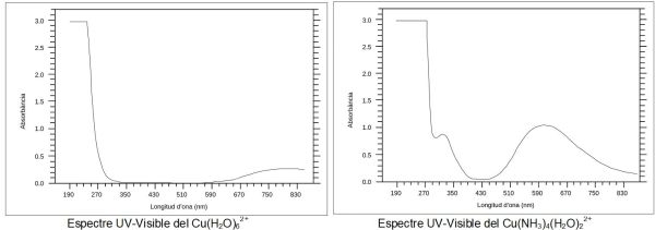Els compostos i les solucions d’ions metàl·lics de transició poden ser acolorits (és a dir, absorbeixen part de la llum visible) pel fet que els electrons en els àtoms de metall es poden excitar des d’un estat electrònic a un altre. El color de les solucions d’ions metàl·lics es veu molt afectat per la presència d’altres espècies, com alguns anions o lligands. Per exemple, el color d’una solució diluïda de sulfat de coure és blau, però si afegim amoníac s’intensifica molt el color i canvia la longitud d’ona d’absorció màxima (de 837 a 608 nm). La demostració als laboratoris escolars del canvi de color quan s’afegeix amoníac a una dissolució de sulfat de coure (II) és un clàssic (mireu Experimentos de química recreativa con sulfato de cobre pentahidratado de Santiago Heredia, pag. 472).