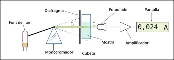 Les parts bàsiques d’un espectrofotòmetre són una font de llum (sovint una bombeta halògena de wolframi per a les longituds d’ona visibles, o una làmpada d’arc de deuteri a l’ultraviolat), un suport per a la mostra, una reixeta de difracció o monocromador per separar les diferents longituds d’ona de la llum, i un detector. El detector sol ser un fotodíode o un CCD. Els fotodíodes s’usen amb monocromadors, que filtren la llum de manera que una sola longitud d’ona arriba al detector. Les reixetes de difracció s’utilitzen amb CCDs, que recullen la llum de diferents longituds d’ona en píxels.