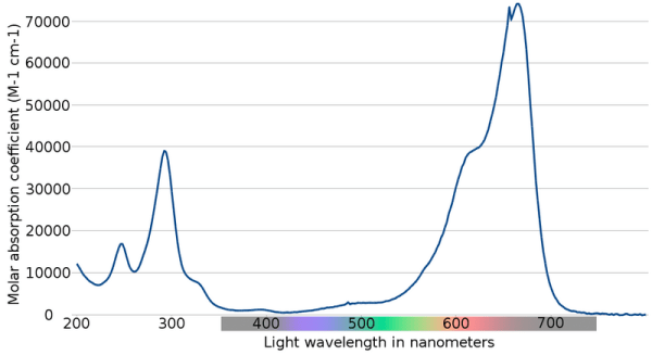 Aquest altre espectre, del blau de metilè, representa el coeficient d’absorció molar (no el seu logaritme) davant la longitud d’ona, amb una forta absorció a la zona del vermell (600 – 700 nm), el que es correspon amb el color amb el que veiem aquesta substància.