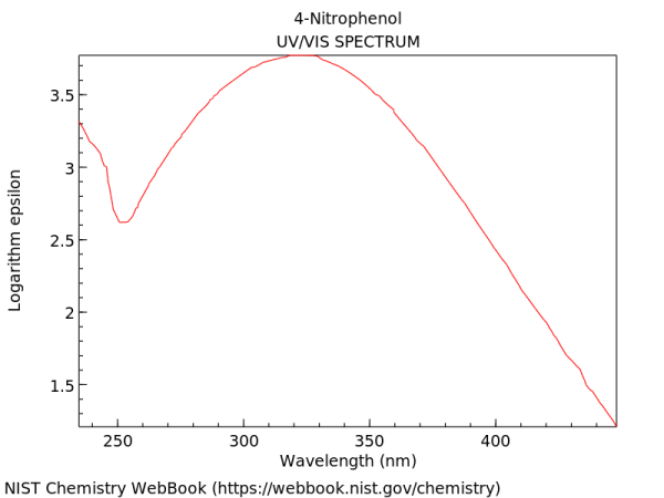 Les radiacions ultraviolades i visibles tenen en comú el fet que l’absorció a les dues regions provoca l’excitació d’electrons a nivells d’energia superiors. Però la major part de les vegades l’excitació electrònica va acompanyada de canvis vibracionals i rotacionals de les molècules i, per això, el que podrien ser fines línies d’absorció apareixen als espectres de la regió ultraviolada-visible com una banda ampla. Com exemple, a sota teniu l’espectre UV-Vis del nitrofenol, amb un màxim que el defineix a 325 nm. Malgrat que aquest gràfic s’acaba als 450 nm, la regió que abarquen els espectres d’aquestes radiacions ultraviolades i visibles va de 200 a 800 nm.