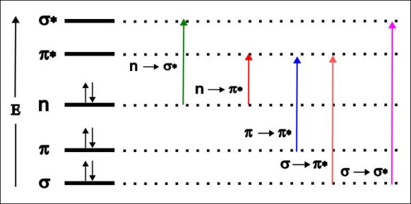 Com s’aprecia en el gràfic els salts entre els orbitals sigma, per exemple, són molt més energètics que entre els pi, el que fa que la longitud d’ona de la radiació absorbida en aquestes últimes transicions sigui molt més petita. Només els compostos orgànics amb un alt grau de conjugació, amb molts dobles enllaços conjugats, absorbeixen llum en la regió visible de l’espectre electromagnètic quan pateixen salts entre enllaços moleculars pi .