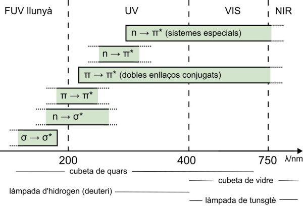El següent gràfic representa la relació entre les diferents transicions electròniques possibles i la longitud d’ona λ absorbida expressada en nanòmetres (nm), el que és el mateix, la zona de l’espectre electromagnètic en que els compostos absorbiran.