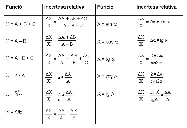 És evident que aquest error dependrà del tipus de funció. El nivell de les matemàtiques emprades per trobar la relació pot ser diferent. Aquí ens acontentarem amb una aproximació simple a alguna de les relacions més senzilles, que després completarem amb un quadre resum del càlcul dels errors de les mesures indirectes que amb més probabilitat ens podem trobar.